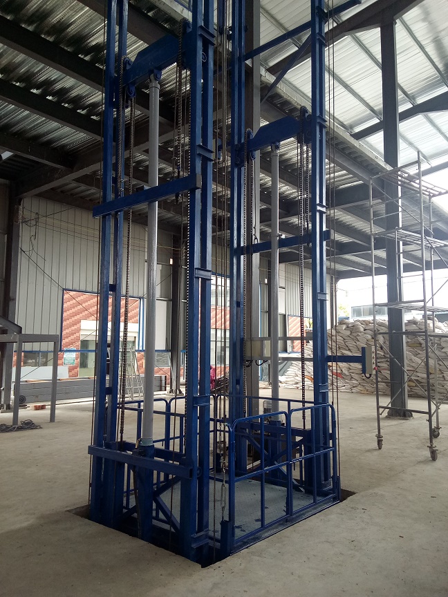 導軌式液壓貨梯:貨物提升機主要用各種工作層間貨物上下運送;立體車庫和地下車庫二層以上高樓間、無法開挖地坑場所、頂層高度不能到達要求的場合等比較難解決的狹小空間,